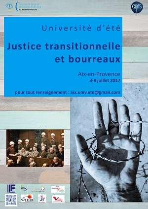 Ce séminaire est dispensé dans le cadre de l'Université d'été en Justice transitionnelle qui se tient du 3 au 8 juillet 2017 et est organisée par l'UMR 7318 "Droit international comparé et européen" et l'Association francophone pour la justice transitionnelle à la Faculté de droit et science politique de l'Université d'Aix-Marseille.