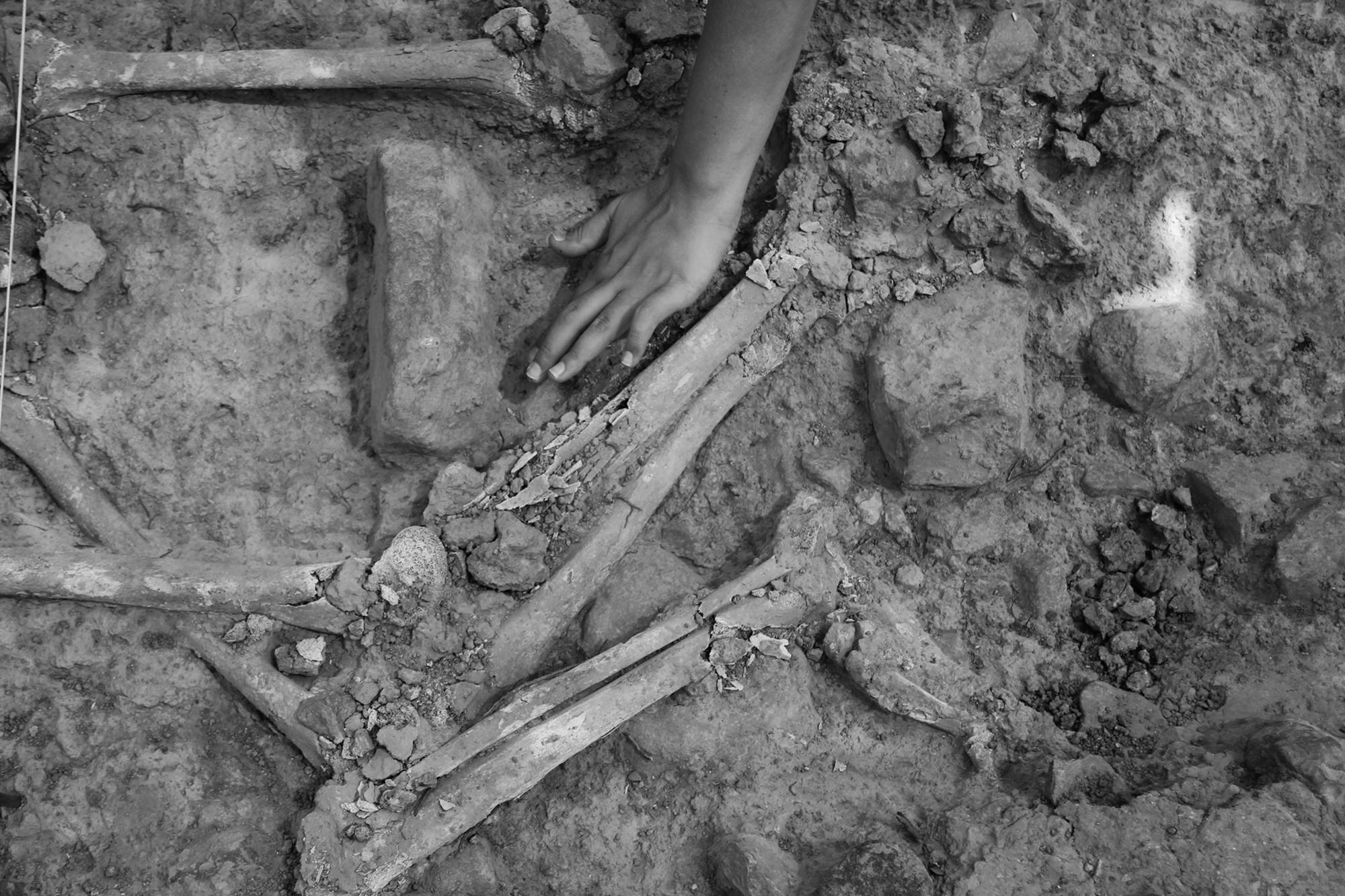 An archaeologist excavates the human remains of three Republican guerrilleros (guerrilla fighters) killed and buried in a mass grave in the postwar period.